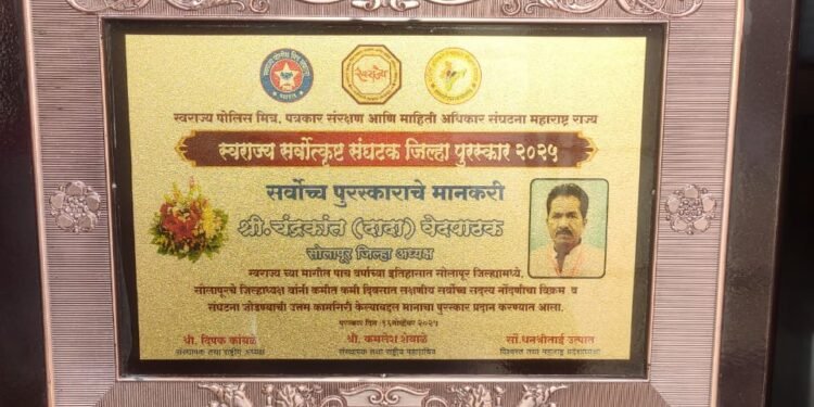 अक्कलकोट – स्वराज्य माहिती अधिकार संघटनेच्या मागील पाच वर्षाच्या इतिहासात सोलापूर जिल्ह्यात जिल्हाध्यक्ष चंद्रकांत वेदपाठक यांनी कमीतकमी दिवसात लक्षणीय असे सर्वोच्च सदस्य नोंदणी चा विक्रम व संघटना जोडण्याचा सर्वोत्तम कामागिरी केल्याबद्दल त्यांना स्वराज्य सर्वोत्कृष्ठ संघटन जिल्हा पुरस्काराने सन्मानित करण्यात आले.