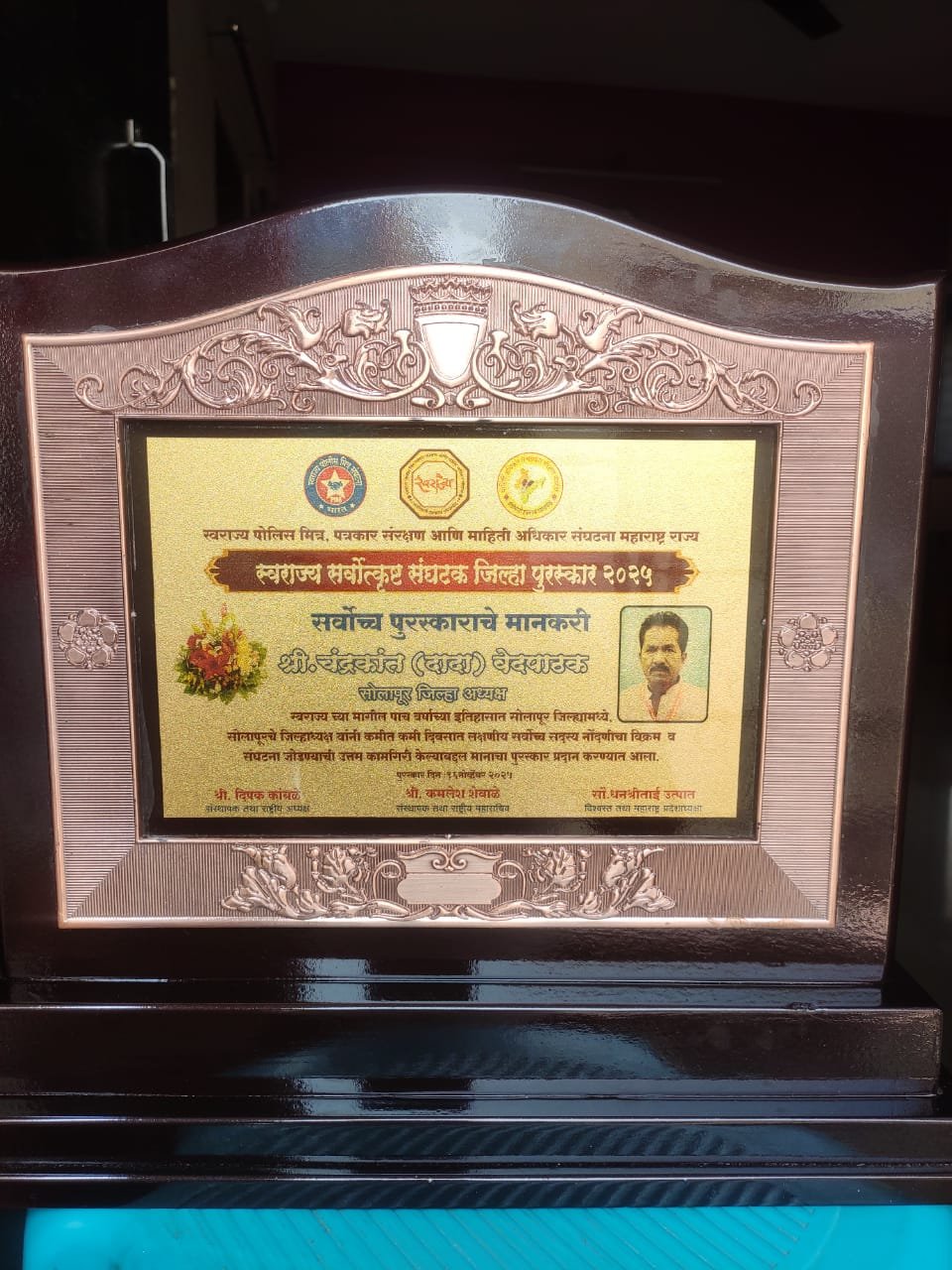 अक्कलकोट – स्वराज्य माहिती अधिकार संघटनेच्या मागील पाच वर्षाच्या इतिहासात सोलापूर जिल्ह्यात जिल्हाध्यक्ष चंद्रकांत वेदपाठक यांनी कमीतकमी दिवसात लक्षणीय असे सर्वोच्च सदस्य नोंदणी चा विक्रम व संघटना जोडण्याचा सर्वोत्तम कामागिरी केल्याबद्दल त्यांना स्वराज्य सर्वोत्कृष्ठ संघटन जिल्हा पुरस्काराने सन्मानित करण्यात आले.