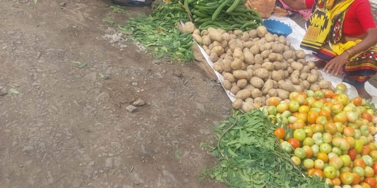 २) उन्ह पाऊस चिखल साचलेल्या पाण्या जवळ रस्त्यावर आठवडा सोमवार बाजार भरल्याचे छायाचित्र