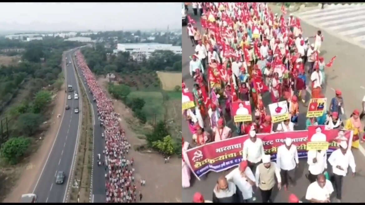 VIDEO | मुंबईच्या दिशेनं लाल वादळाचं झंजावती दृश्य; ड्रोन मधून टिपला शेतकऱ्यांचा थक्क करणारा मोर्चा…..