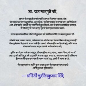 राम सातपुते यांच्या उमेदवारीवर मत व्यक्त करताना प्रणिती शिंदे यांनी सोलापूर हे कायमच बहुभाषिक, बहुधार्मिक, सर्वधर्मसमभाव मानणारं शहर आणि जिल्हा असून इथे सर्वांना आपली मतं मांडण्याची मुभा मिळते. मग तो इथला असो किंवा बाहेरचा सोलापूरची लेक म्हणून मी तुमचं सोलापुरात स्वागत करते, अशा शब्दात प्रणिती शिंदे यांनी सातपुते यांना उपरोधिक टोला लगावला आहे.