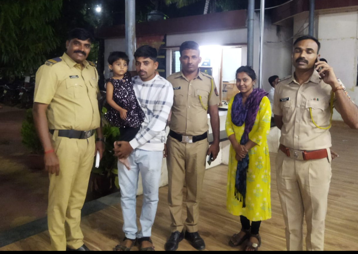 त्या बालिकेला पालकांच्या ताब्यात देताना पोलीस उपनिरीक्षक नागेश बनकर,ठाणे अंमलदार कृष्णा जाधव,मुलीचे वडिल तसेच नंदा गायकवाड आदी छायाचित्रात दिसत आहे.