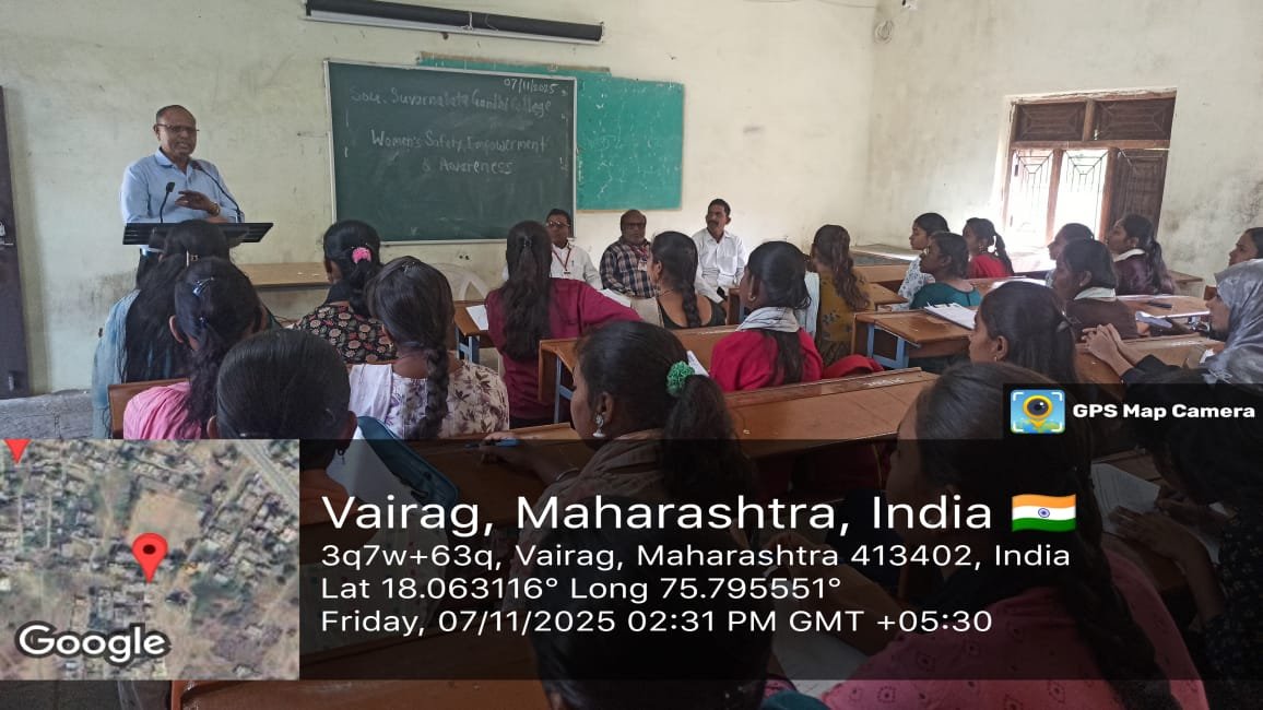 बार्शी – सौ. सुवर्णलता गांधी महाविद्यालय, वैराग येथे शुक्रवार रोजी महिला सुरक्षा, सक्षमीकरण व जागरुकता कार्यक्रम तसेच वंदे मातरम या राष्ट्रगीताला दीडशे वर्ष झाल्यामुळे सामूहिक सुरात वंदे मातरम गीत गायन करण्यात आले.