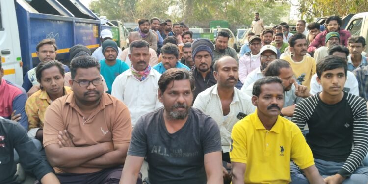 सोलापूर : शहरातील कचरा संकलन करणाऱ्या झोन चार आणि पाच कडील घंटागाडी कामगारांनी आपल्या मागण्यांकडे लक्ष वेधत संप पुकारला. जुळे सोलापूर येथील डी मार्ट च्या मागील बाजूस असलेल्या झोन पाचच्या आवारात एकत्र येत सुमारे दीडशे कामगारांनी जोरदार निदर्शने केली. गेल्या दोन महिन्यापासून पगार दिला जात नसल्याने संताप व्यक्त केला.